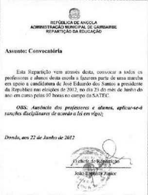 «Esta Repartição vem através desta, convocar a todos os professores e alunos desta escola a fazerem parte de uma marcha em apoio a candidatura de José Eduardo dos Santos a presidente da República nas eleições de 2012, no dia 23 do mês de Junho do ano em curso pelas 07 horas no campo do SATEC.